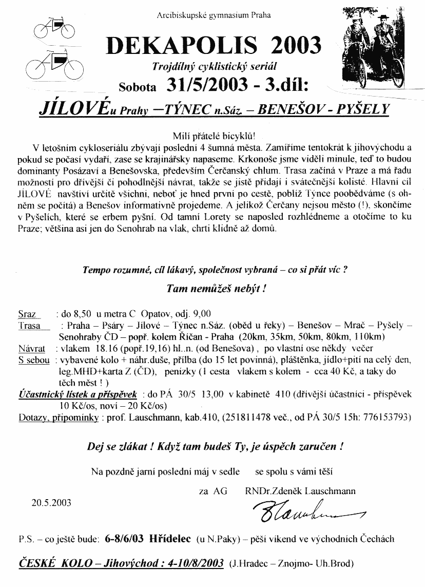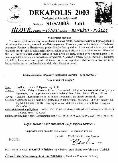 Milí přátelé bicyklů,v letošním cykloseriálu zbývají poslední 4 šumná města.DEKAPOLIS 2003Sobota 31.5. 2003 - 3. díl:Jílové u Prahy - Týnec n.Sáz. - Benešov - Pyšely