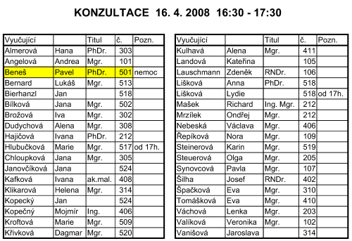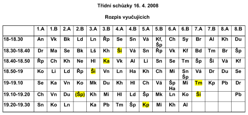 Přikládáme rozpis, podle nějž se budou učitelé ve třídách střídat (18.00 - 19.30), a tabulku se jmény učitelů a adresami jejich kabinetů kvůli individuálním konzultacím (16.30 - 17.30). Pokud někteří učitelé nejsou v tabulce konzultací uvedeni, znamená to, že v den třídních schůzek nebudou ve škole přítomni.