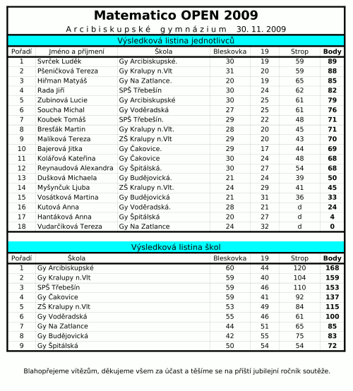 9. ročník soutěže MATEMATICO proběhl velmi úspěšně. Sešlo se 18 jednotlivců z 9 škol. Výsledky přináší následující tabulka.Na shledanou při jubilejním 10. ročníku na podzim 2010!