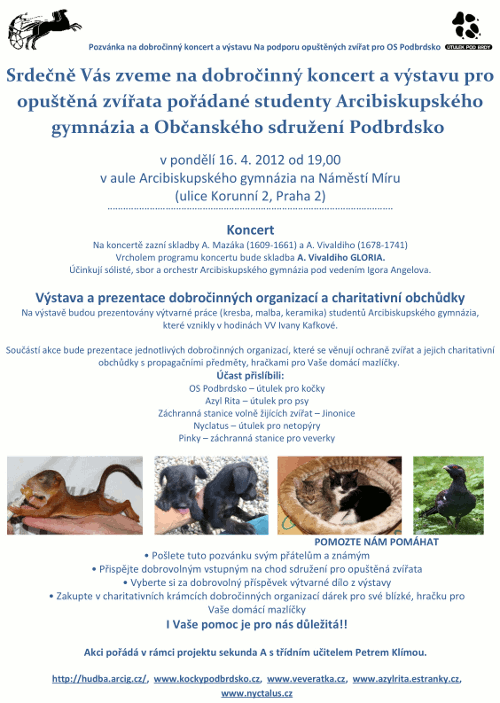 Srdečně Vás zveme na dobročinný koncert a výstavu pro opuštěná zvířata pořádané studenty Arcibiskupského gymnázia a Občanského sdružení Podbrdsko
