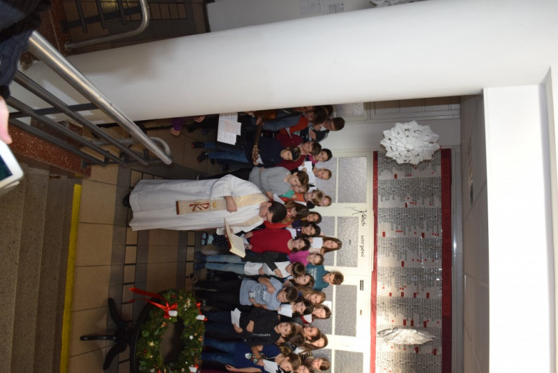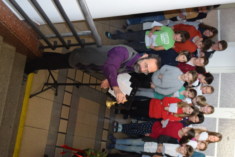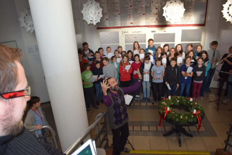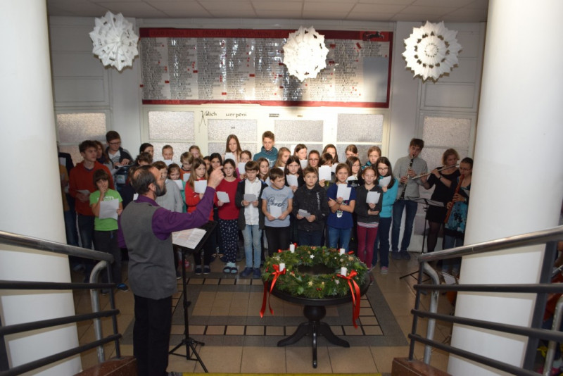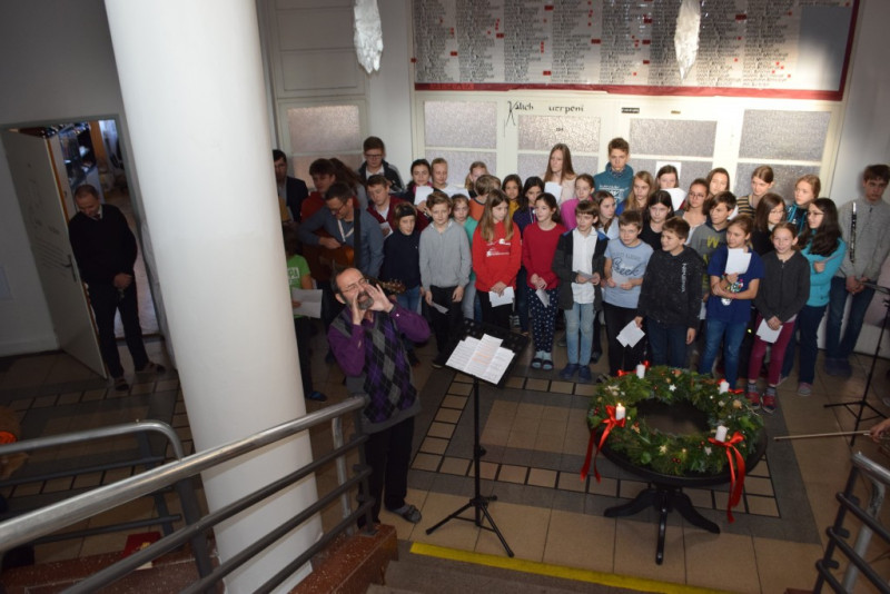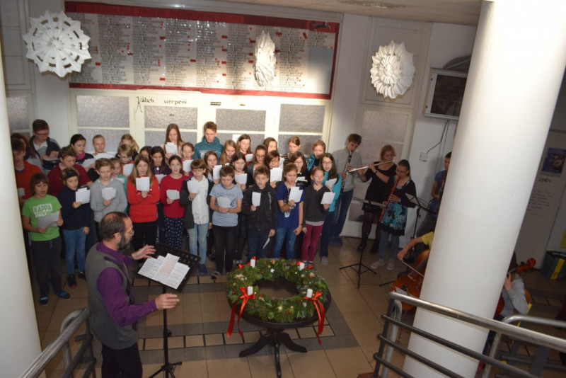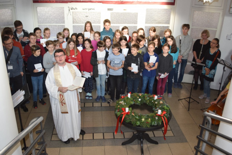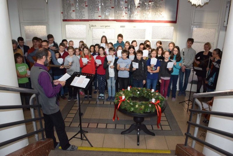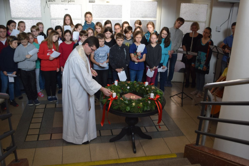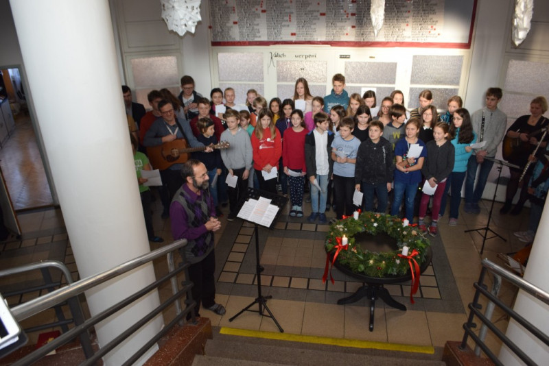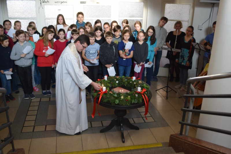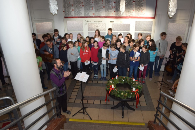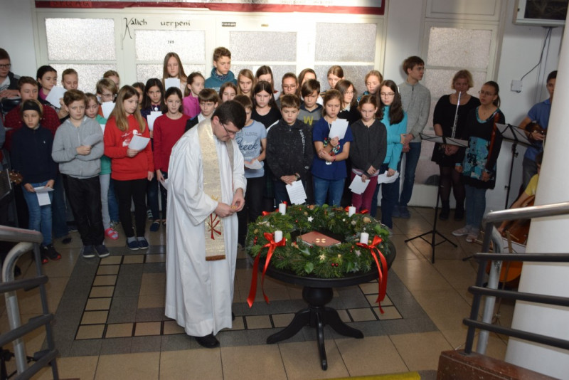V pátek 6. prosince v 10:55 zazněly na schodišti AG tóny staré adventní písně z r. 1410 „Aj čas vzácný přišel“ za doprovodu smyčcových a dechových nástrojů. Současně byl po čtení úryvku evangelia p. Klimentem požehnán adventní věnec a duchovní náladu doby adventní podtrhla závěrečná píseň doprovázená kytarou evangelického kněze Romana Mazura „Celé věky čekaly“.