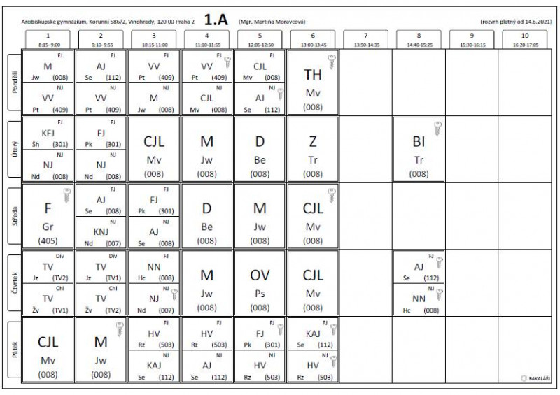 V pondělí dochází k letošní poslední změně rozvrhu, díky uvolnění hygienických podmínek se vrací tělocvik. Rozvrh je prakticky stejný jako ten, se kterým jsme školní rok v září začínali.
